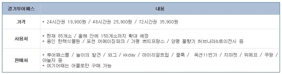 경기투어 패스는 경기도 여행을 자유롭고 편리하게 이용할 수 있습니다. 다양한 관광지를 효율적으로 즐기고 싶다면, 경기투어 패스를 구매하여 적극 활용해보세요.